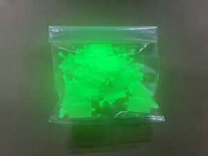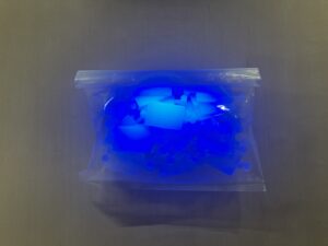- 色相:通常照明下では透明、UVを照射するとレッド、ブルー、グリーンに発光する